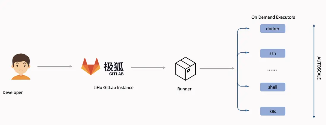 Runner 是極狐GitLab CI 的一個重要組件,它能夠幫助運行 CI/CD 流水線中所定義的 Job。當研發人員提交代碼變更後,極狐GitLab 就會“通知” Runner 去按照 .gitlab-ci.yml 定義的流水線步驟完成變更代碼的構建、測試、部署等,此過程中 Runner 會根據所選擇的 executor(比如針對 PowerShell 的 shell、針對容器的 docker 等)來針對不同環境進行 Job 的運行。關於 executor 的選擇可以參考極狐GitLab 執行器官網。