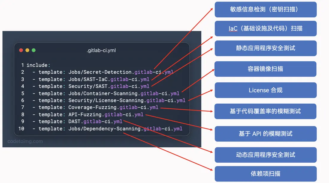 極狐GitLab 內置模版的引用。極狐GitLab 根據自身多年的經驗,沉澱了眾多可以直接複用的模版,使用 template 語法即可使用。最典型的就是極狐GitLab DevSecOps 模版的引用。極狐GitLab DevSecOps 有密鑰掃描、依賴項掃描、SAST、DAST、容器鏡像掃描、模糊測試及許可證合規檢測功能,所有功能兩行代碼即可開啓。
