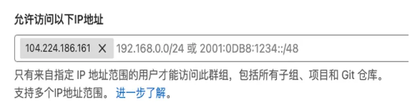 例如企業有外包團隊,那麼代碼需要對其開放,可通過在羣組中添加公司內網或某辦公區 IP 地址為 IP 訪問白名單,不同羣組可設置不同的 IP 訪問白名單。這樣,外包團隊只能在指定辦公區網絡下才可以訪問代碼倉庫。