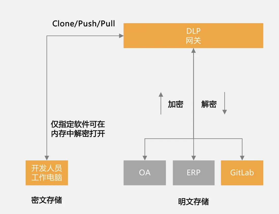 通過 DLP 網關拉取下來的代碼在磁盤中是加密狀態,即便通過 U盤或者其他方式發佈到外網也無法直接打開,只能通過 DLP 網關信任的客户端、IDE 打開,在內存中是解密狀態,可進行正常的開發工作,一旦落盤存儲就又變為加密狀態,從而實現數防泄漏。