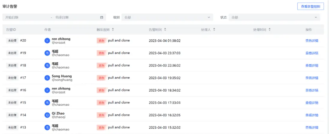 例如,誰在什麼時間,通過什麼 IP,從代碼庫中拉取了什麼代碼,拉取了多少次等,這些信息都可以記錄下來。有了這些信息,則可以進行規則設置。