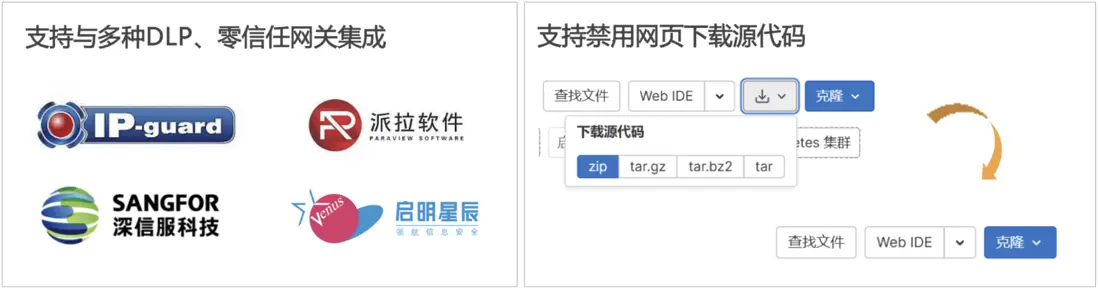 極狐GitLab 可以集成行業內主流的 DLP 網關如 IPGarud、綠盾等,並且可以關閉在極狐GitLab 網頁上下載代碼,限制獲取代碼的渠道,以便更好的與 DLP 工具集成,進一步提高數據保密性。