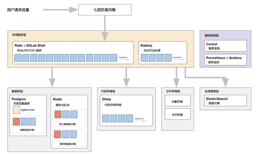 極狐GitLab 在數據存儲方面使用了多個組件,如 PGSQL 用於存儲用户信息、倉庫路徑等元數據、Redis可作為緩存或消息隊列,因為 PGSQL 和 Redis 作為主流中間件都有自己的高可用方案,所以不少客户已經將極狐GitLab 實例中的這些組件替換為第三方的高可用組件,這是一個好事,説明大家對高可用很重視。