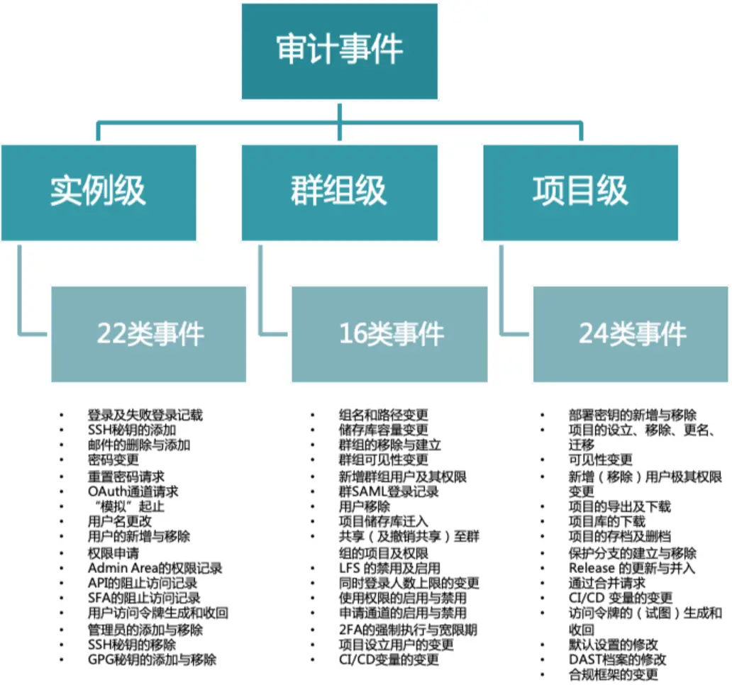 最後是「事後」措施。它主要是對極狐GitLab 中所發生的事件、人員行為進行記錄、分析、追蹤,甚至是告警,以實現對代碼泄露事件的防範或追溯。