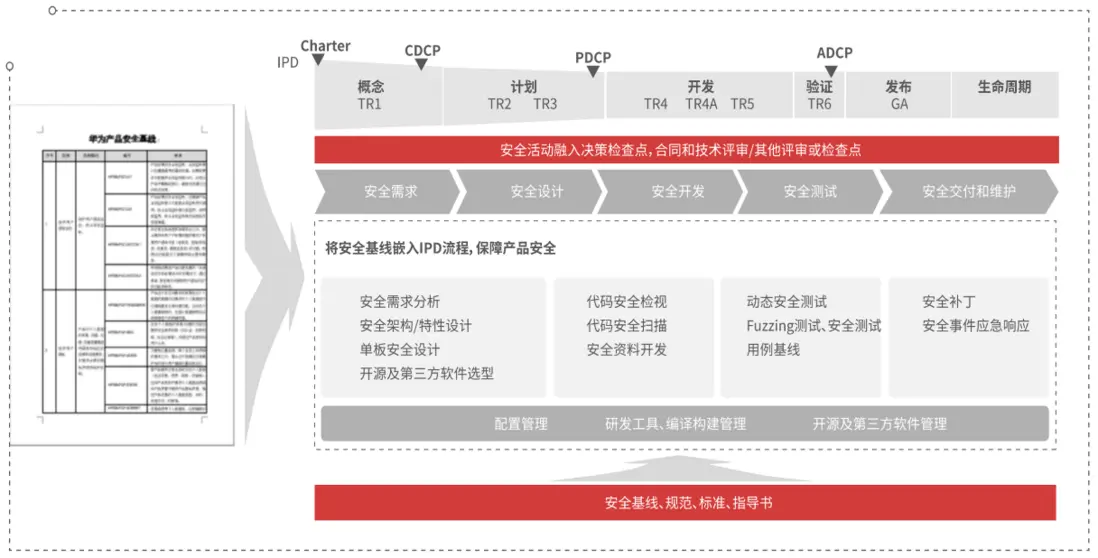 如下圖,華為內部有一套安全紅線,包括了安全基線、規範標準指導書、各種各樣的掃描工具,每個項目研發流程需要遵循這一套機制,運行各種審核,各種節點確認,來保證產品和項目交付安全,可想而知其成本之高和效率之低。