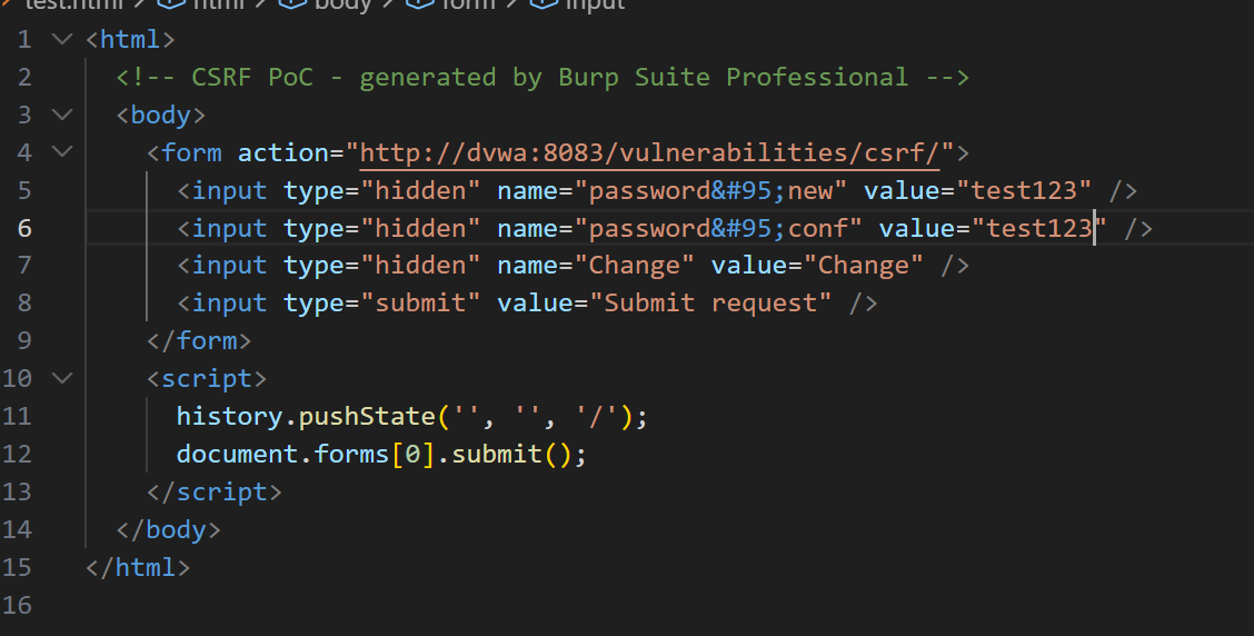 <form action="http://dvwa:8083/vulnerabilities/csrf/?" method="GET"> <!--此處根據自己的靶場地址替換 -->