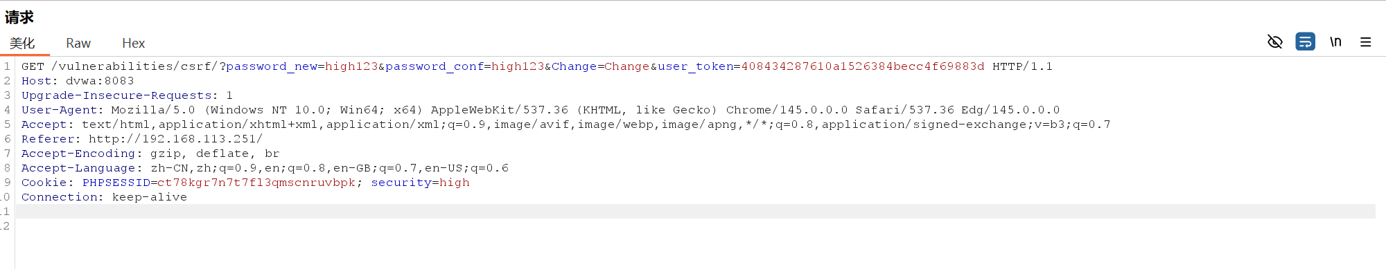 所以要想成功修改密碼,就要使Referer字段嚴格等於目標網站域名,即http://dvwa:8083(這裏看你自己的本地域名),我們可以使用burpsuite來修改HTTP頭部的Referer字段。