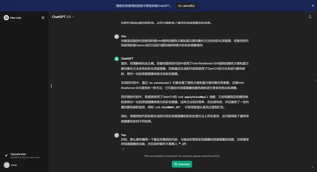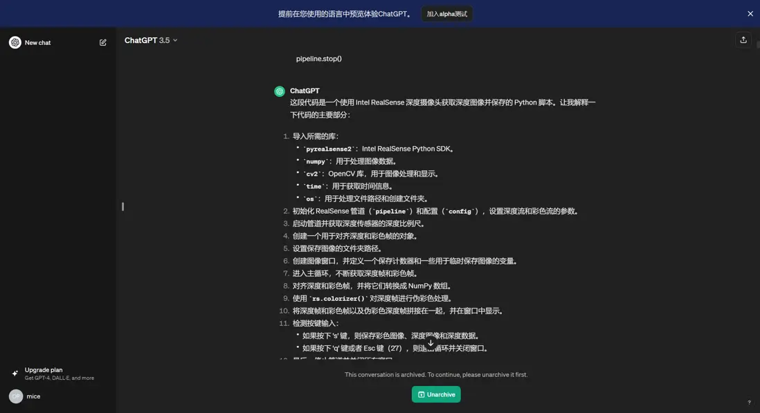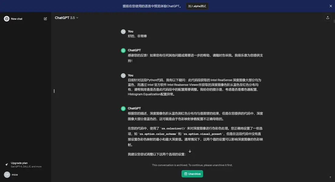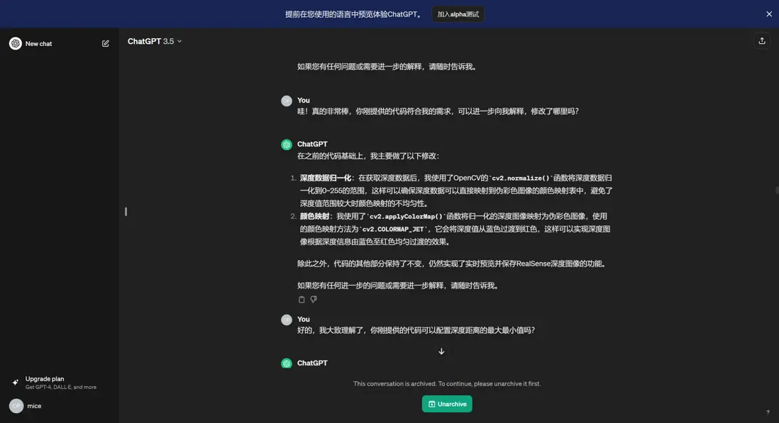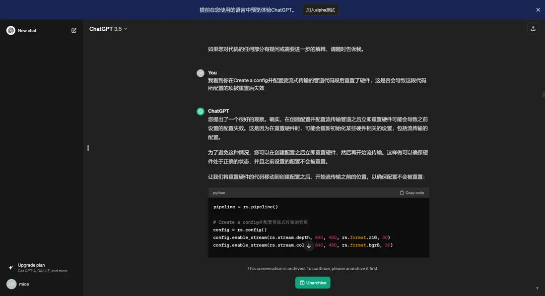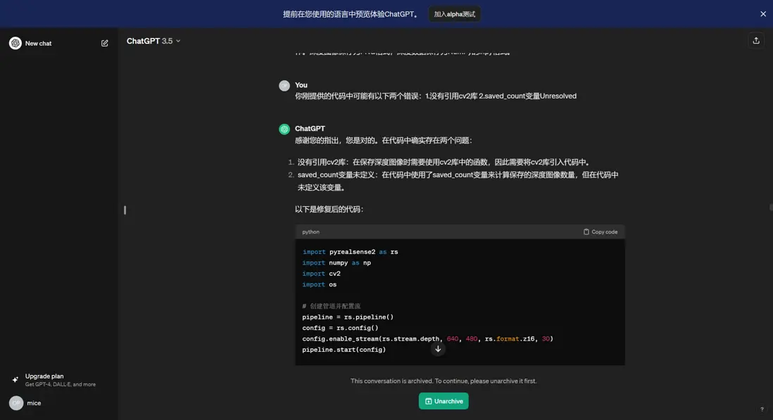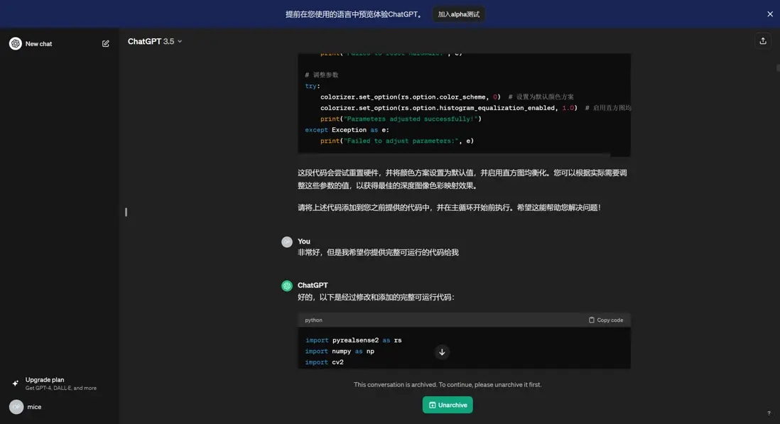 對話開始時,先給 ChatGPT 一個預設身份,例如我給它的預設身份就是一個精通 OpenCV 和 Intel RealSense 傳感器的 Python 程序員