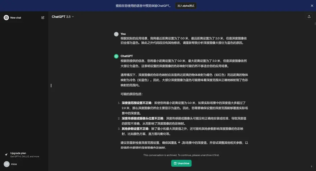 在確定 ChatGPT 對代碼理解沒有大的偏差以後,我就提出了我想解決的問題。簡單補充一下問題背景,RealSense 是一款深度相機,可以獲得拍攝物體的距離信息,在官方的軟件上會以熱力圖的形式展示,而我所編寫的代碼所得到的深度圖像是藍色的,而不是像官方軟件一樣由紅色到藍色變化。我高強度 Google 搜索了接近兩天,圖中提到的着色器配置和直方圖均衡化就是我所蒐集到的線索信息,但是不論怎麼調試都不起作用,於是想到了 ChatGPT。我就把這兩點作為問題排查的方向提供給了 ChatGPT,這也是一個 AI 協作的小技巧吧,當你搜索到一些可能對解決問題有幫助的信息時,可以提供給 AI 這樣可以大大縮短解決問題所需的時間。