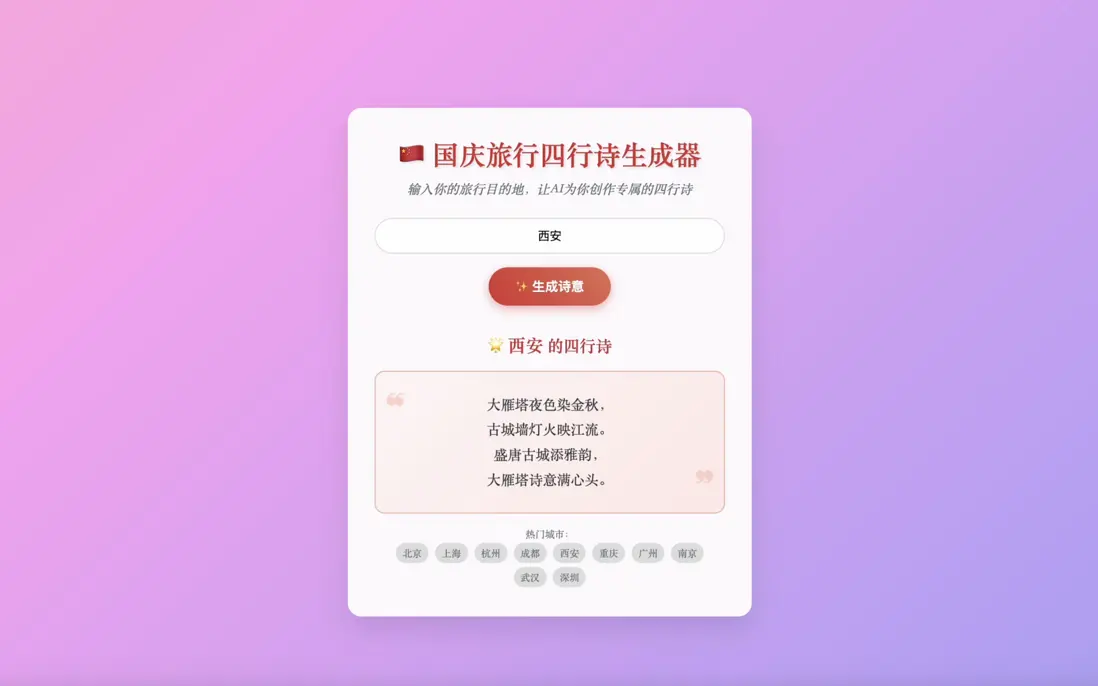 來看看最初版效果吧,嘗試輸入旅行城市“西安”,基本功能和交互是具備的,並且提示了熱門旅遊城市,背景還是漸變的,生成的詩也不錯~