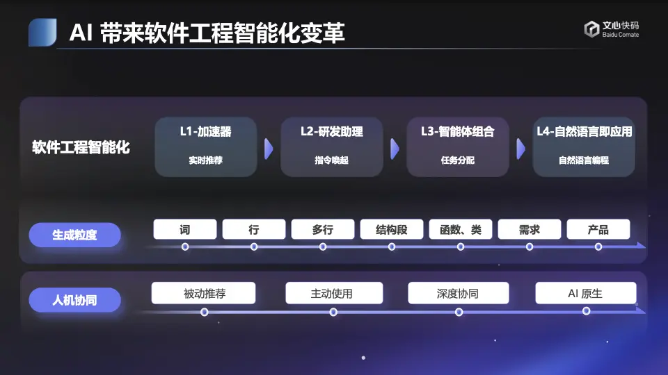 文心快碼始終站在軟件工程智能化的前沿。在L2階段,快碼已具備理解項目架構、分析代碼邏輯、自動驗證與調試的能力,成為真正意義上的“AI研發助理”。而當研發邁入L3階段——智能體組合時代,這將成為AI驅動軟件工程的關鍵轉折點:研發模式正從“人+工具”向“人機協同”演進;研發者的角色邊界也在模糊化,“一人即團隊”的超級個體時代正在到來。與此同時,AI在代碼貢獻中的佔比將逐漸超過人類開發者,軟件開發範式由此被徹底重塑。