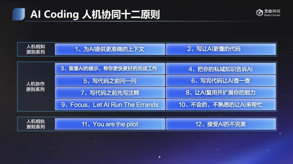在分享最後,他鼓勵年輕開發者們,要主動擁抱變化,AI時代的研發人才應當具備產品思維、精通技術架構、掌握人機協同的方法技巧,善於用AI解決問題,同時分享了“人機協同十二原則”,引發現場開發者們的關注。