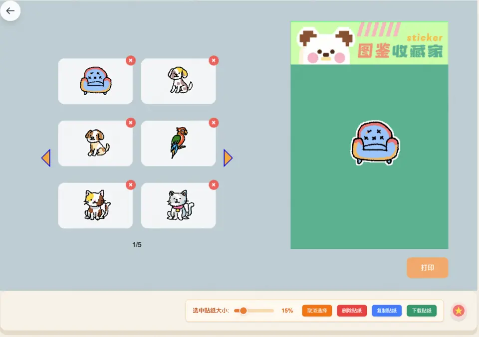 - 給畫完的畫做了洪水填充效果,並且加了描邊效果,看起來像貼紙一樣,貼紙可以直接複製到剪切板,直接發送到聊天框或者文檔,也支持一鍵下載單個貼紙,而非整個貼紙;