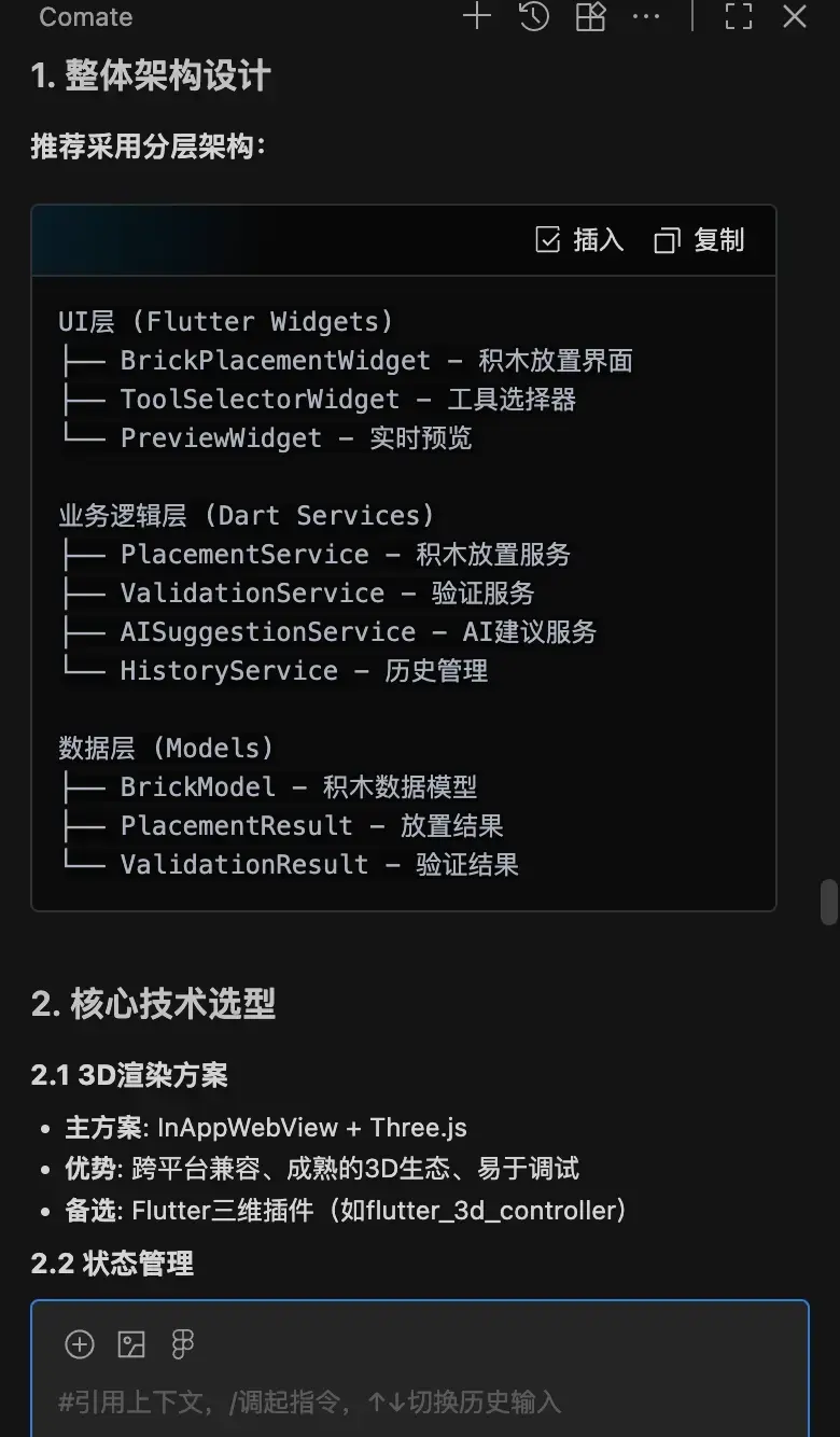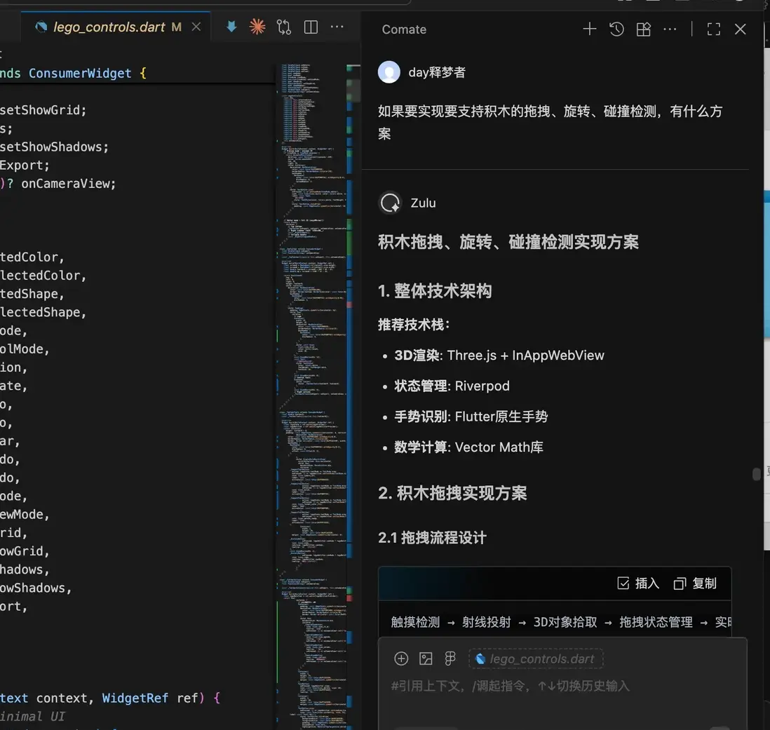 3D積木渲染是整個項目的技術核心,涉及到複雜的3D數學計算和圖形學知識。我告訴Comate:"要支持積木的拖拽、旋轉、碰撞檢測,幫我找合適的方案,先不要修改。"它提出了好幾種算法,我確認沒問題後,再讓AI開工。