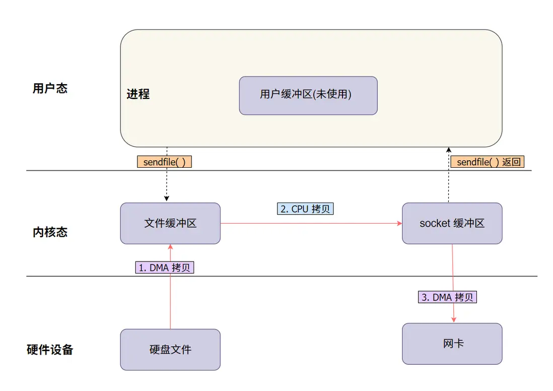 | sendfile | 直接將文件數據發送到套接字,無需拷貝到用户空間。 | 完全零拷貝 | 極少,數據直接傳輸。 | 文件服務器、視頻流傳輸等大文件場景。 |