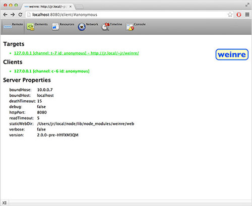 Setting up Weinre is a bit more complicated because you have to install it on both the server and the page. To get started, install Node, and then install the Weinre module with the following command: