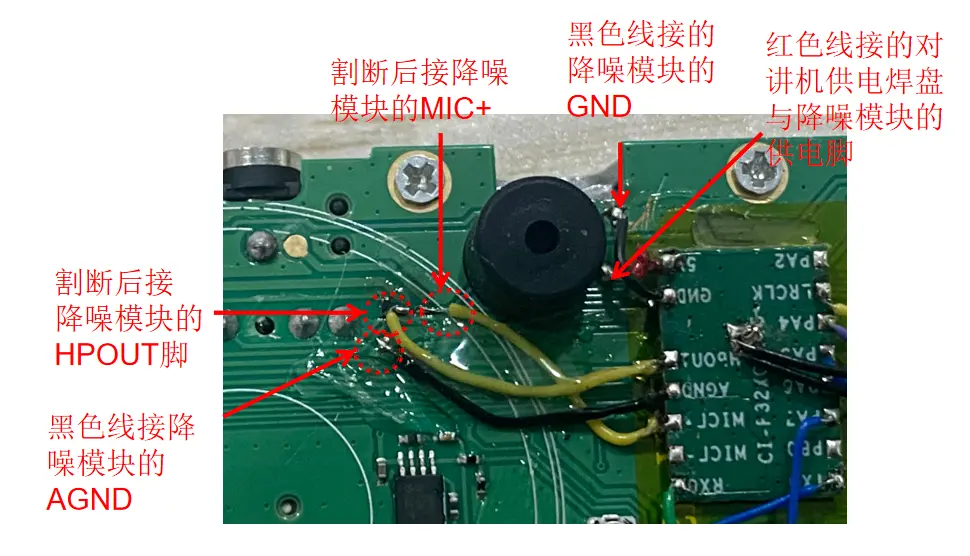 根據降噪模塊規格書,知道需要連接供電(3.3V)、地、麥克風線路,我們分別在對講機上查找這些網絡。把一些地銅皮刮開,麥克風的連接線割斷。