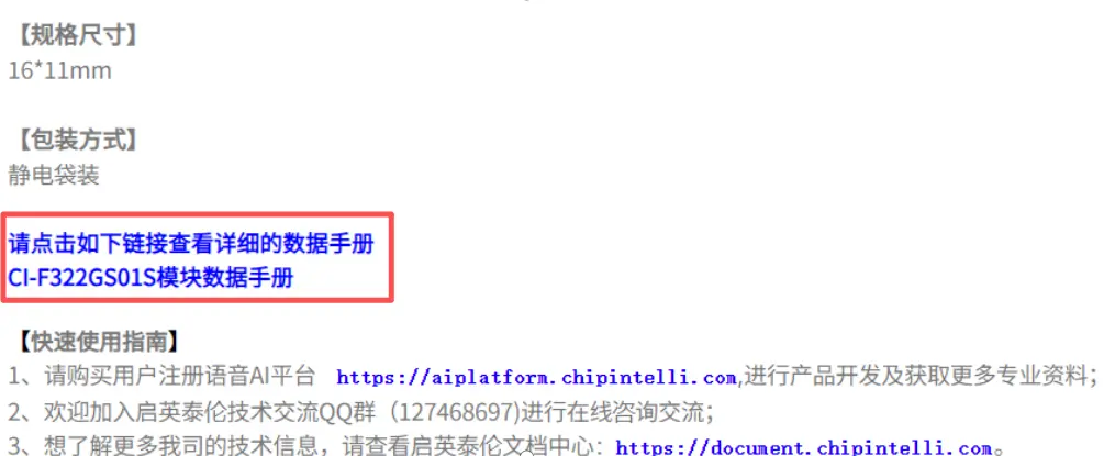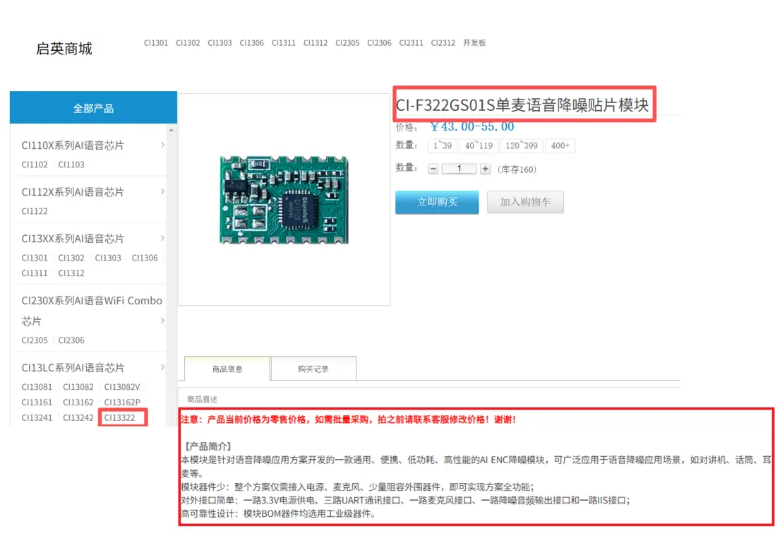 ①在啓英泰倫官方商城購買一套CI-F322GS01S單麥語音降噪貼片模塊,網址如下:啓英商城。