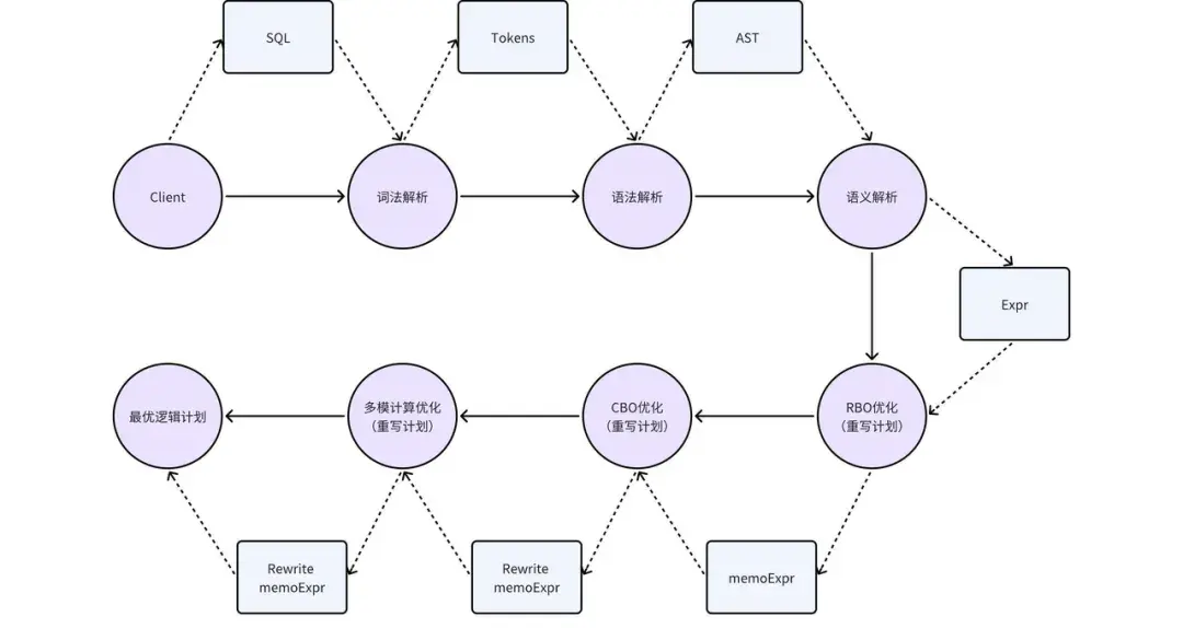 在 KWDB 的編譯階段,SQL 語句主要經歷詞法解析、語法解析和語義解析三個處理步驟。其中,為進一步優化執行計劃,在語義解析階段還會同步進行 RBO 優化。
