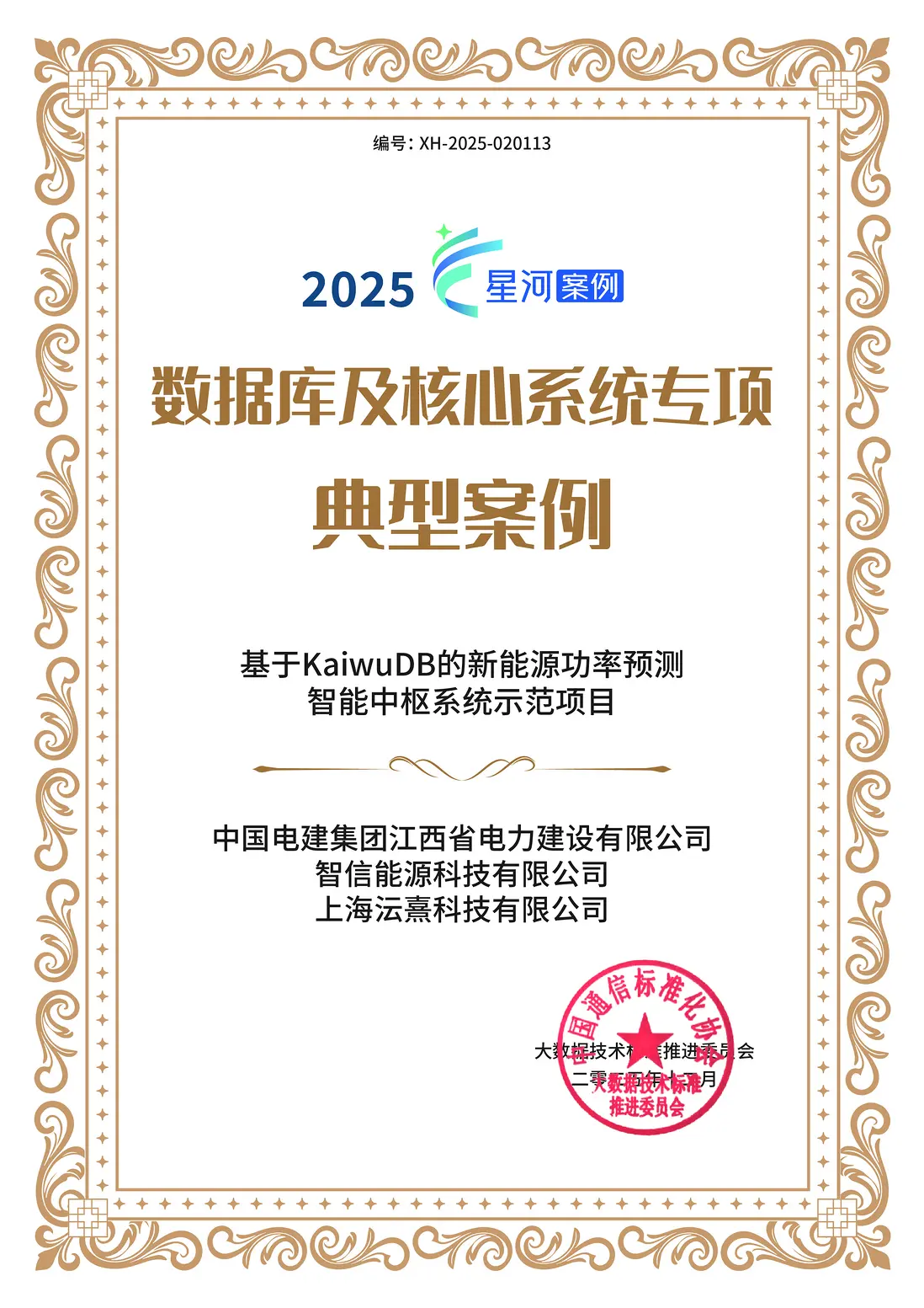 12 月 18 日,在 2025 數據資產管理大會上,由上海沄熹科技有限公司(簡稱"KaiwuDB")與中國電建集團江西省電力建設有限公司(簡稱"江西電建")、智信能源科技有限公司(簡稱"智信能科")聯合申報的"基於 KaiwuDB 的新能源功率預測智能中樞系統示範項目 ",榮獲 2025 第九屆數據智能"星河(Galaxy)"案例評選的數據庫及核心系統專項"典型案例"。