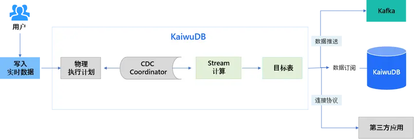 KaiwuDB 使用 SQL 定義實時流變換,當數據被寫入流的源表後,數據會被以定義的方式自動處理,並根據定義的觸發模式向目的表推送結果,替代了傳統複雜流處理系統(如 Kafka、Flink),在高吞吐的數據寫入的情況下,提供毫秒級的計算結果延遲。