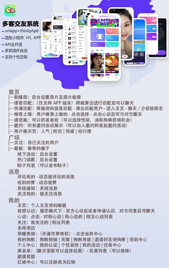 付費會員與增值服務、隱私保護機制、線上/線下活動報名、靈魂匹配(根據信息)、左滑右滑心動、漂流瓶、邀約、圈子帖子(可發佈付費內容)、紅娘牽線(專屬紅娘端口)、邀請獎勵等。