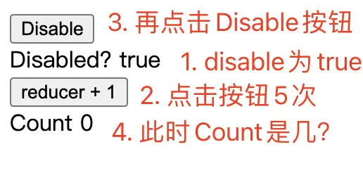 現在問題來了,當disabled props為true時(此時count為0),我們點擊reducer + 1按鈕5次,然後再點擊Disable按鈕(disabled props會變為false),此時count為多少呢?