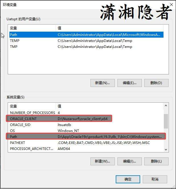 檢查後發現這台機器上其實不僅僅安裝了Oracle數據庫軟件,還安裝一個Oracle instance client(D:\Nuzarsurf\oracle_client\x64), 由於環境變量的順序設置,決定了其優先級,此時讀取的是Oracle instance client下的網絡服務名,而這位朋友在(D:\App\Oracle19c\product\19.3\db_1\network\admin\tnsnames.ora)這個路徑下面的tnsnames.ora設置的網絡服務名,其實此時沒有生效,其實要麼在(D:\Nuzarsurf\oracle_client\x64)路徑中的tnsnames.ora設置網絡服務名,可以解決這個問題.也可以通過調整PATH的先後順序解決這個問題. 如下所示: