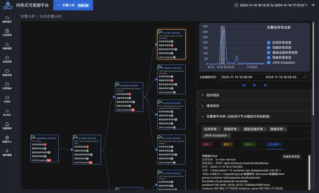 該功能通過自動分類告警和關聯分析數據,將告警與應用和業務入口精準關聯。通過深入分析業務入口的告警,用户可以檢查告警事件與服務之間的關係。“告警回溯”利用拓撲結構對告警事件進行邏輯回放,幫助用户定位故障節點。最終通過檢查故障節點的延時報告和錯誤報告瞭解節點當前存在的問題和原因。這些功能為用户提供了全面的告警和故障分析能力,減少了故障排查的時間和成本。