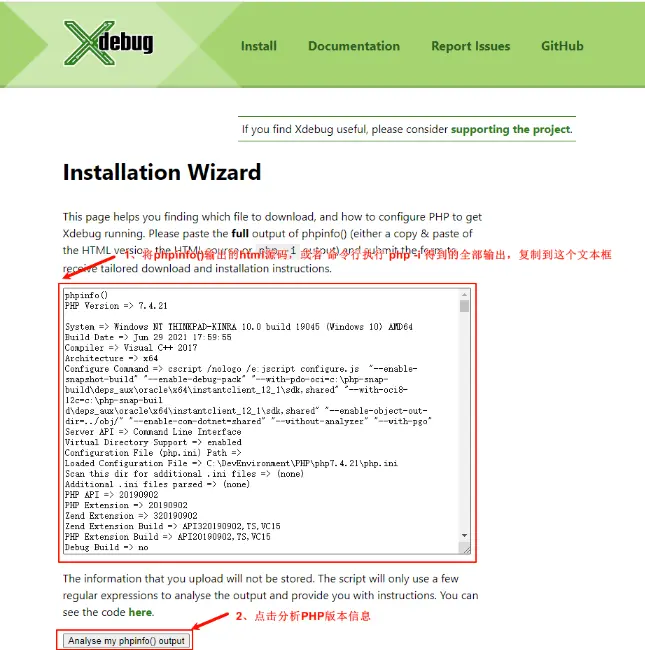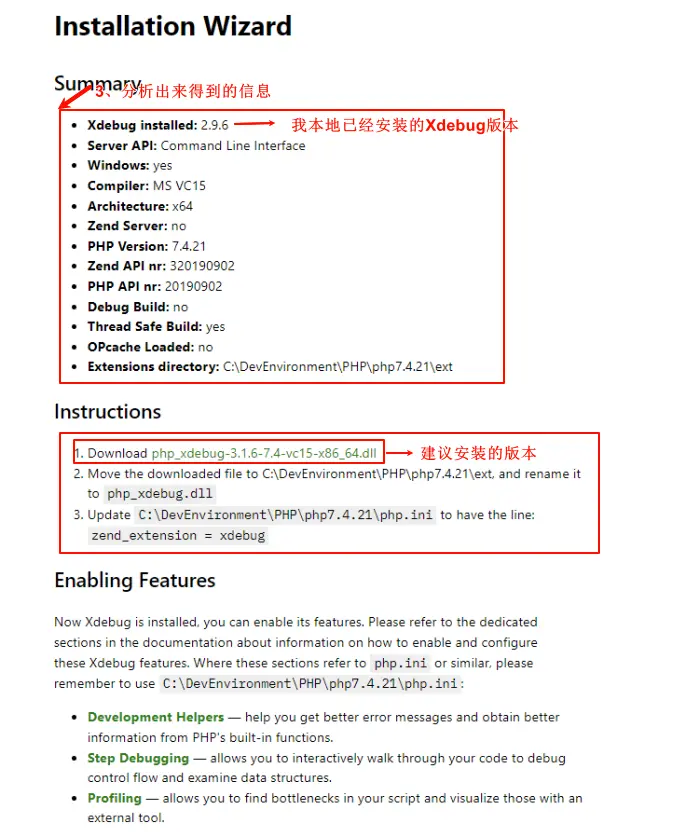 Xdebug 官方提供了適配各個 PHP 版本的擴展包,開發者可以自行根據需要下載對應的擴展包。如果你不清楚需要哪個版本的Xdebug,你可以這樣。粘貼 phpinfo() 的完整輸出(HTML版本、HTML源代碼或 php -i 輸出的複製和粘貼)並提交 Installation Wizard,此頁面將會告知你需要下載的Xdebug版本。