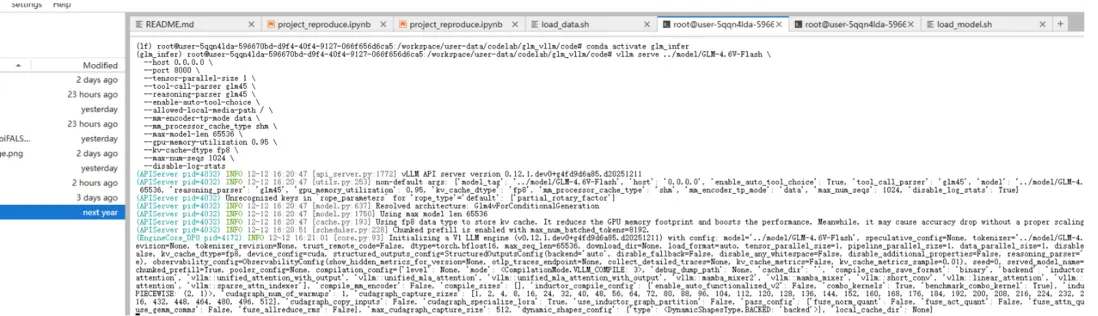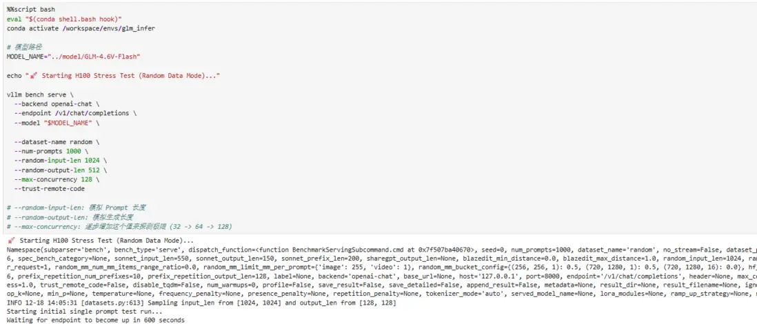 直接在文檔裏面運行代碼,這段代碼的意思是:切到指定conda 環境,然後用 vLLM 自帶的壓測工具,對 GLM-4.6V-Flash(9B)做“隨機數據模式”的高併發吞吐/延遲壓測。