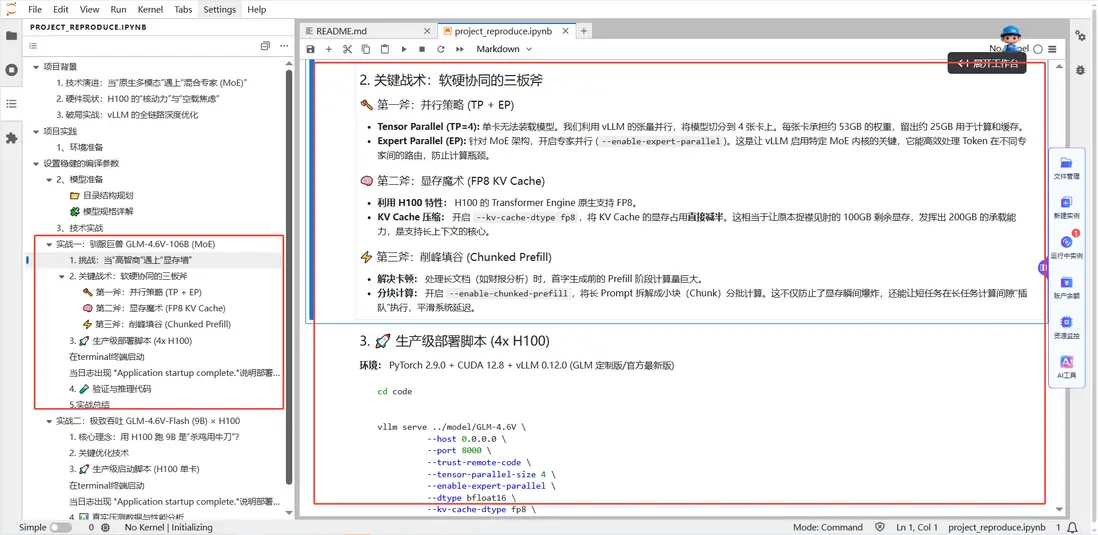 實戰總結:通過上述配置,我們成功將GLM-4.6V-106B 部署在 4 張 H100 上,利用 FP8 KV Cache 解決了長文本顯存瓶頸,並通過 Expert Parallel 釋放了 MoE 架構的推理性能。這是一個可直接用於生產環境的高性能方案。