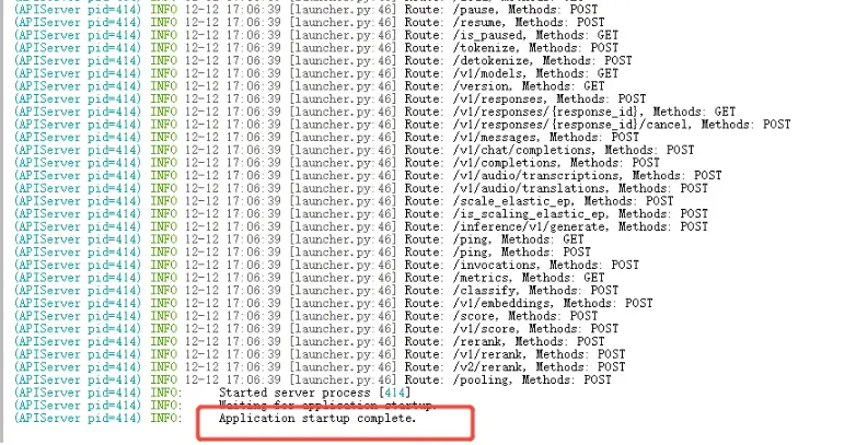 配置完成後,同樣在終端啓動服務器,當日志出現"Application startup complete."説明部署完成。記得關閉之前的服務器。