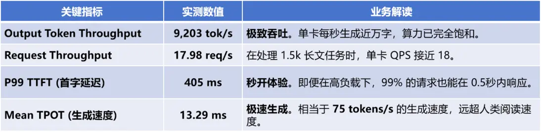 為了排除網絡下載數據集的不穩定性,我們使用vLLM 內置的 random 數據集進行純算力壓測,模擬高負載場景(輸入 1024 tokens / 輸出 512 tokens)。