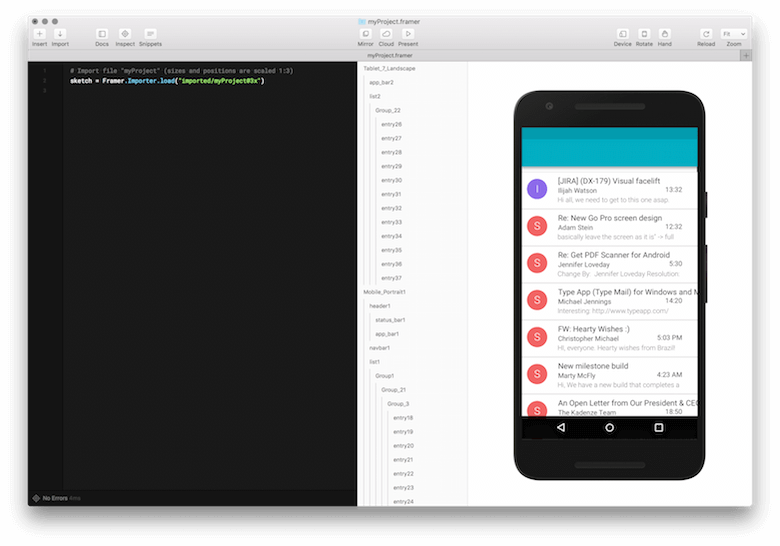 Framer takes the programming approach: The designer is required to program their prototype in CoffeeScript. The prototype is immediately previewable in Framer Studio and can also be viewed on actual devices or in the browser.
