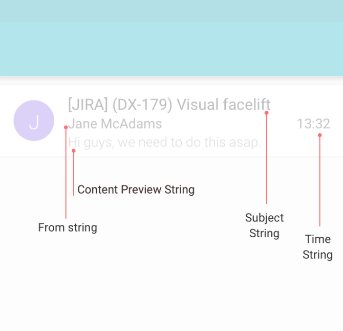 Now, the most efficient way for me to avoid having to copy and paste is to have all text entries — see “Subject,” “From,” “Content Preview” and “Time” in the example below — as variables and to dynamically load predefined strings of data for each entry.