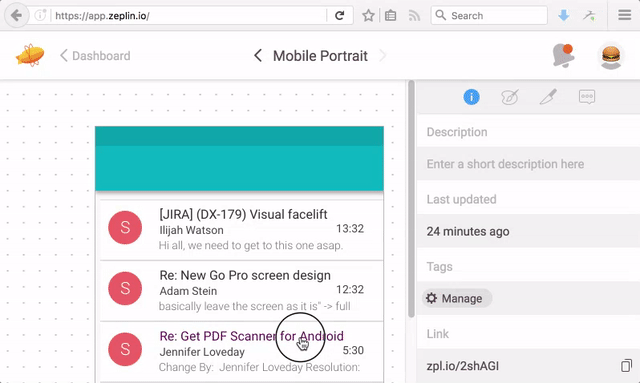 Zeplin is a cloud-based toolset for creating automated design specifications and for designer-developer collaboration. Its main feature is that it reads and parses all of your Sketch artboards in a file, uploads them to a web server, and provides a web interface for other collaborators to view them. Once your artboards have been crunched and uploaded, anyone who checks them out on a computer can click and hover about and see all margins, paddings, fonts, HEX codes and other properties of all objects in the design.