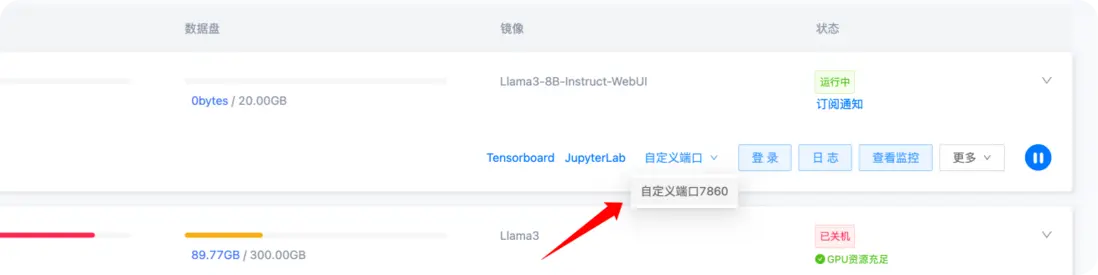 ③ 端口重置成功後點擊自定義端口7860,跳轉到Llama3模型的web控制枱