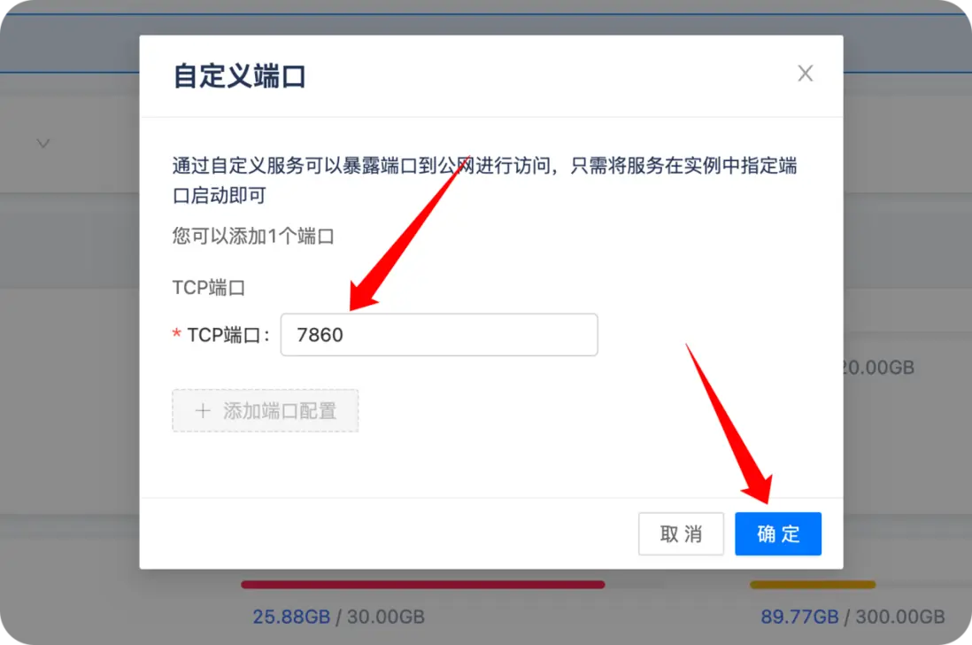 ② 輸入7860端口(該端口為實例中 text-generation-webui 監聽的端口),然後點擊確定