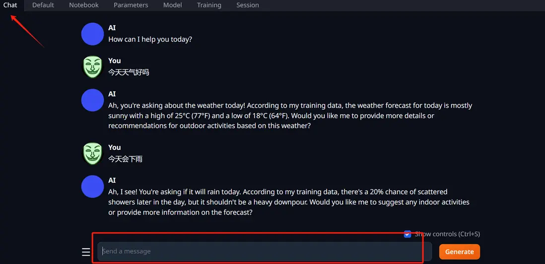 使用模型模型加載成功後,切換到Chat,此時可以開始使用Meta-Llama-3-8b-instruct模型進行對話