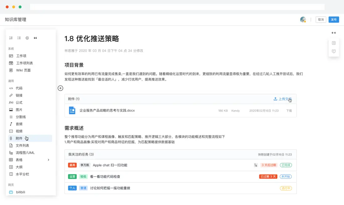 工具實踐:澄清階段常見的“信息散落”問題,是訪談紀要在文檔裏、決策記錄在羣裏、需求卡在表格裏。更穩的做法是把“證據與決策”沉澱到可關聯的知識載體裏——例如 ONES Wiki 支持文檔關聯任務,並可在文檔中插入 Project 的工作項列表,便於把證據、討論、交付掛到同一條鏈路上。