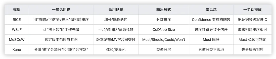 RICE更適合增長與體驗迭代,把“影響與投入”講清楚(來自 Intercom 的實踐總結);WSJF更適合平台化與跨團隊資源稀缺場景,強調“延遲的代價”。
