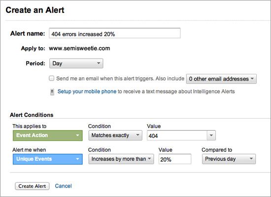 Google Analytics also lets you know of spikes in error messages. The “Intelligence” section allows you to set an alert for when a certain metric reaches a specified threshold. In my case, I want to know when the number of unique 404 errors has increased by more than 20% over the previous day.