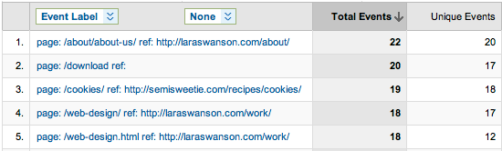 Referring sources for 404 pages is another way to examine the data. Use the “Filter Event Label” search bar to show errors whose referring source is a particular domain. Searching your own domain first is useful to see which incorrect URLs you can quickly fix on your own website.