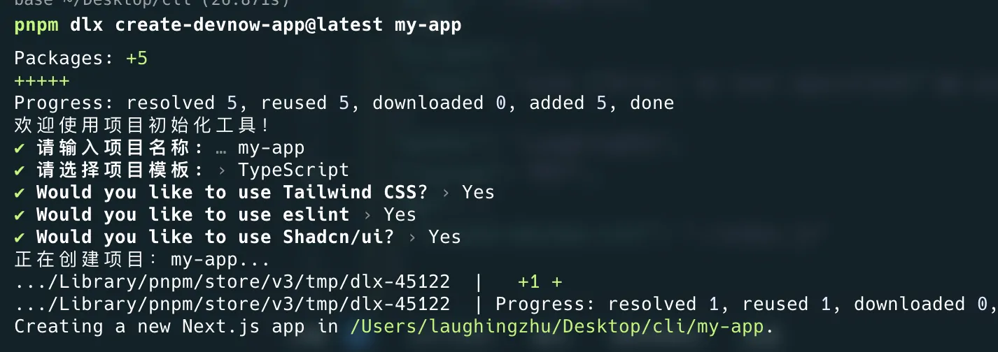 通過使用 prompts 庫,我們可以在 CLI 中實現類似 Next.js 的交互體驗,這樣可以在初始化項目時根據需要選擇不同的選項,體驗會更好一點。