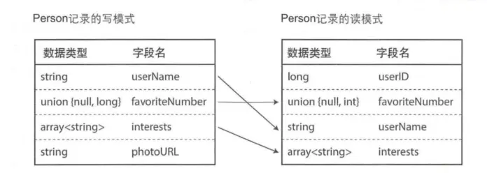 這樣的靈活度不是依靠數據結構本身支撐,而是換了一種思路,對於二進制數據的讀寫制定一套規則,在Avro中被叫做讀寫模式。