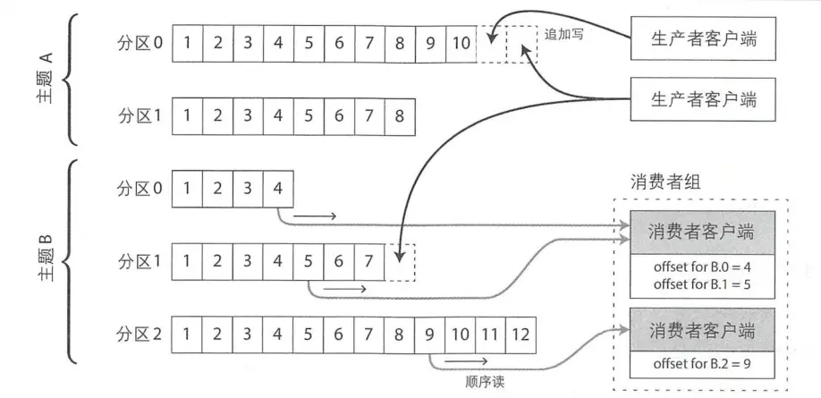 從上面的圖可以看到,生產者按照順序追加到分區後面,消費者維護偏移量記錄消費位置,但是分區的實際消費順序是無法保證的, 只能保證單個分區的消費順序 。