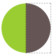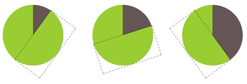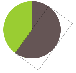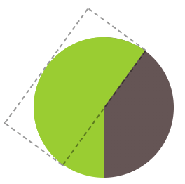 Our pie chart will be green (specifically yellowgreen) with brown (#655) showing the percentage. We might be tempted to use skew transforms for the percentage part, but as a little experimentation shows, they prove to be a very messy solution. Instead, we will color the left and right parts of our circle in our two colors, and use a rotating pseudo-element to uncover only the percentage we need.