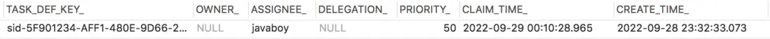 可以看到,此時 ASSIGNEE_ 字段就有值了,同時 CLAIM_TIME 字段也記錄了任務的認領時間。