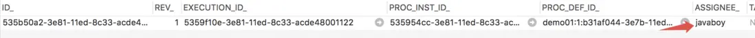接下來,我們部署並啓動這個流程(具體的部署啓動方式可以參考本系列之前的文章),啓動之後,我們可以在數據庫的 ACT_RU_TASK 表中看到,這個 UserTask 的處理人是 javaboy,如下圖:
